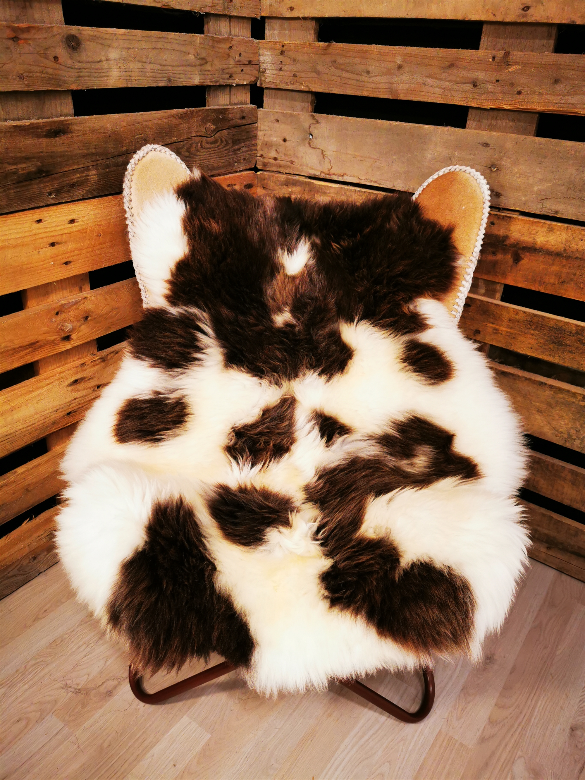 Das Lammfell ist 120cm. Lang. "Jacob Schaf" ist eine sehr seltene Schafrasse, die ursprünglich aus Asien stammt. In der Bibel erwähnt im Zusammenhang mit dem Apostel Jacob (daher der Name). Im 18. Jahrhundert kamen die Jacob Schafe nach England. Das Fell zeichnet sich durch die schwarz/grau/braun/weiße Farbmarkierung aus.