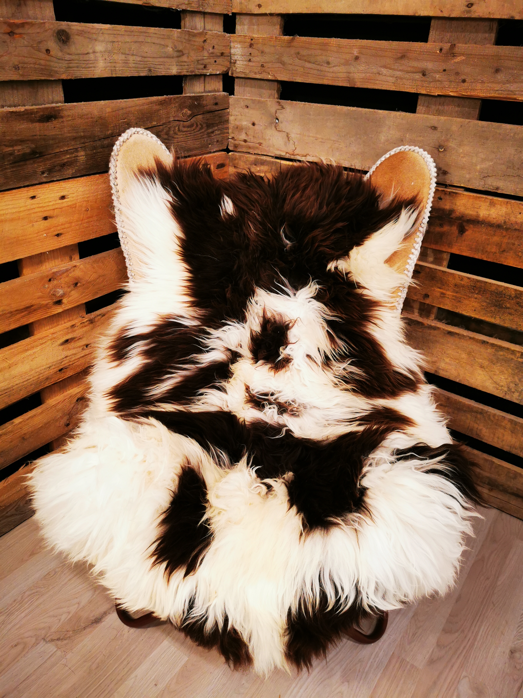 Das Lammfell ist 125cm. Lang. "Jacob Schaf" ist eine sehr seltene Schafrasse, die ursprünglich aus Asien stammt. In der Bibel erwähnt im Zusammenhang mit dem Apostel Jacob (daher der Name). Im 18. Jahrhundert kamen die Jacob Schafe nach England. Das Fell zeichnet sich durch die schwarz/grau/braun/weiße Farbmarkierung aus.