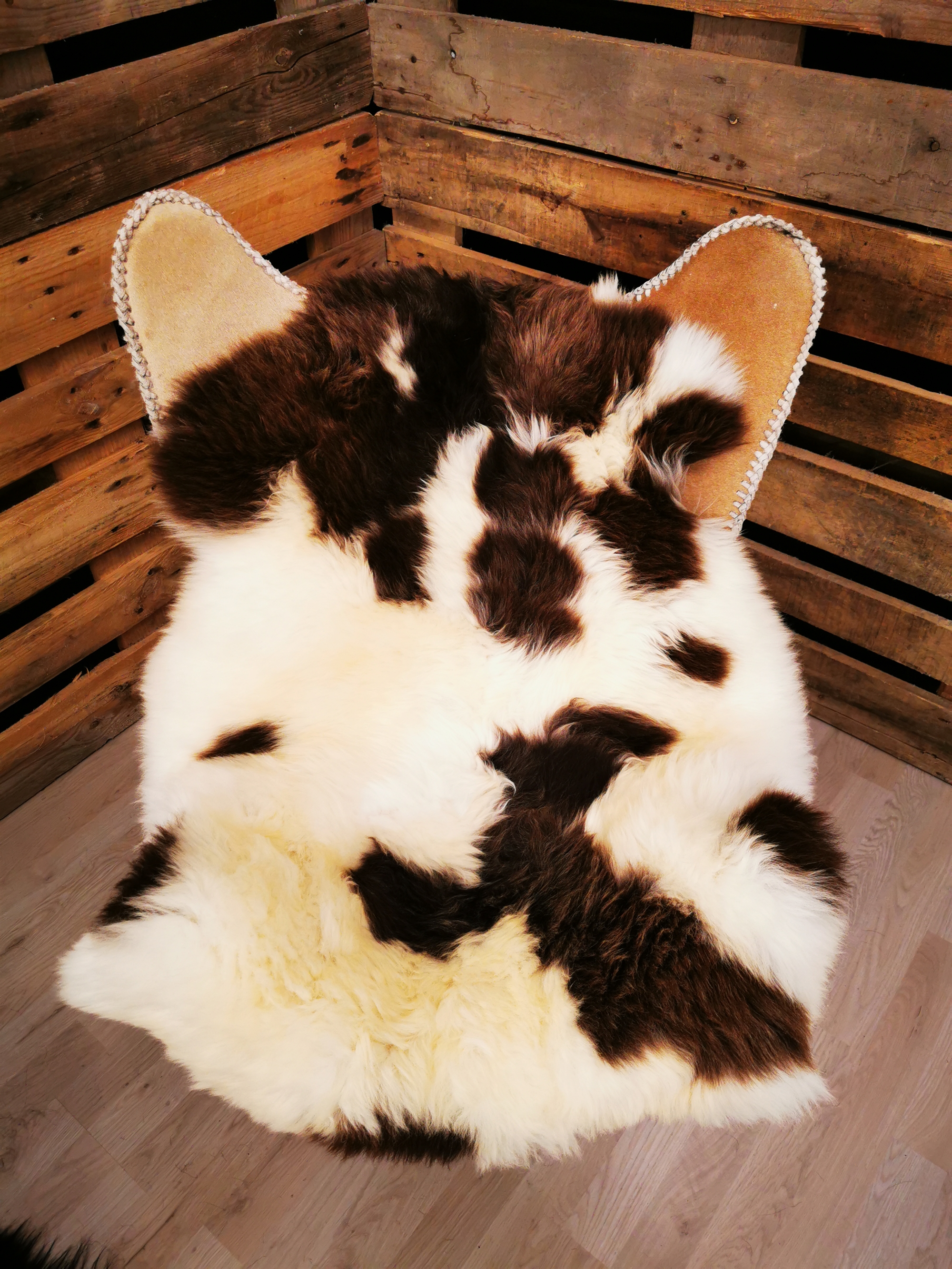 Das Lammfell ist 120cm. Lang. "Jacob Schaf" ist eine sehr seltene Schafrasse, die ursprünglich aus Asien stammt. In der Bibel erwähnt im Zusammenhang mit dem Apostel Jacob (daher der Name). Im 18. Jahrhundert kamen die Jacob Schafe nach England. Das Fell zeichnet sich durch die schwarz/grau/braun/weiße Farbmarkierung aus.