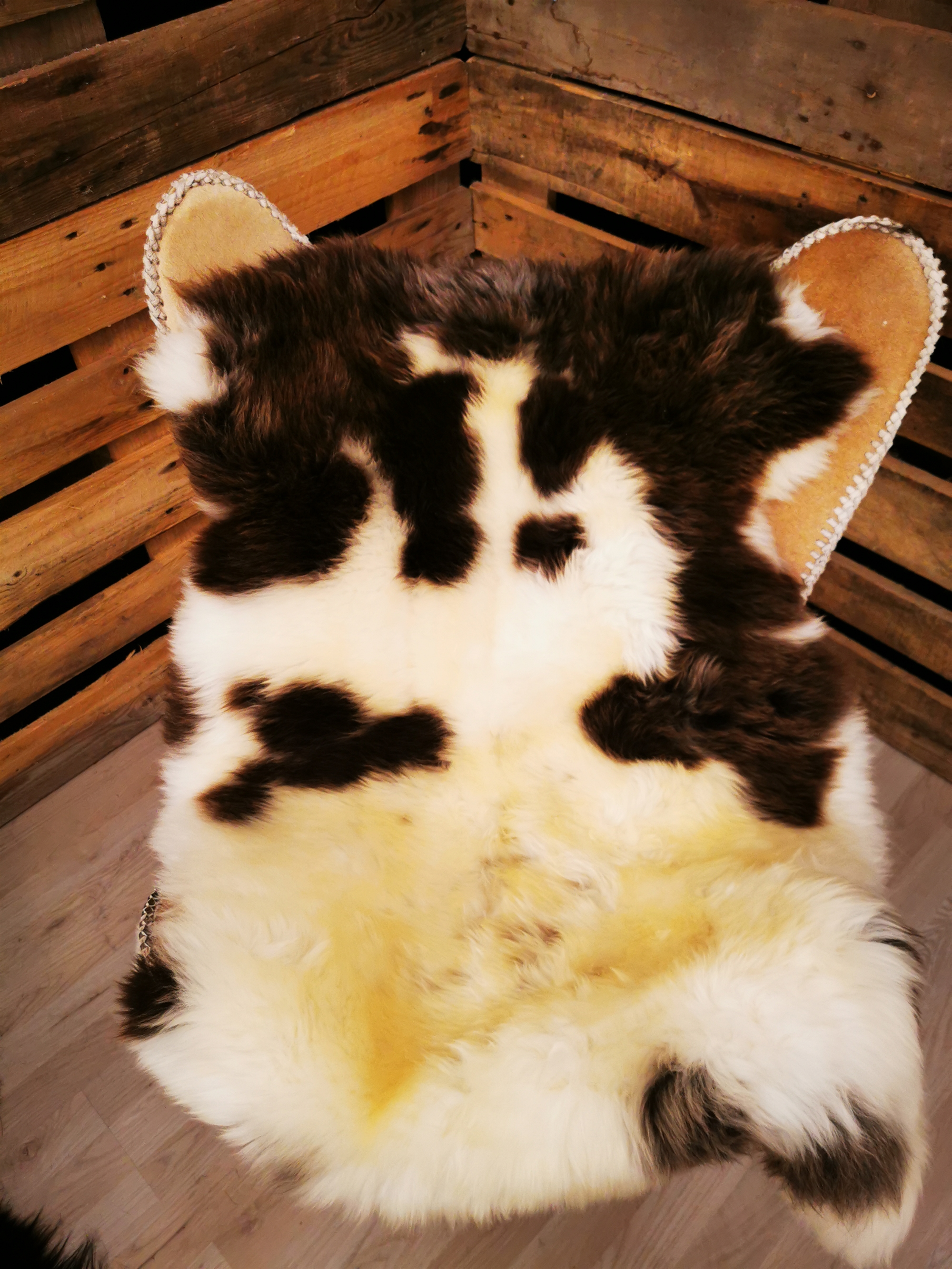 Das Lammfell ist 140cm. Lang. "Jacob Schaf" ist eine sehr seltene Schafrasse, die ursprünglich aus Asien stammt. In der Bibel erwähnt im Zusammenhang mit dem Apostel Jacob (daher der Name). Im 18. Jahrhundert kamen die Jacob Schafe nach England. Das Fell zeichnet sich durch die schwarz/grau/braun/weiße Farbmarkierung aus.
