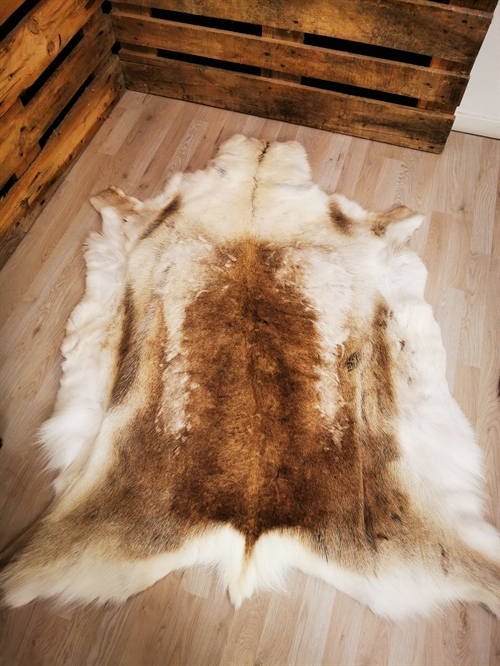Das Rentier ist 140cm. Rentierfell ist bekannt für seine außergewöhnlichen Eigenschaften, die es zu einem beliebten Material für verschiedene Anwendungen machen, insbesondere in arktischen und subarktischen Regionen. Das Fell besteht aus einer dicken Unterwolle und langen, hohlen Grannenhaaren, die zusammen eine hervorragende Isolationsfähigkeit bieten. Die hohlen Haare erzeugen eine Luftschicht, die als wirksame Barriere gegen Kälte dient, während die dichte Unterwolle zusätzlichen Schutz vor Wind und Wetter bietet. Eine der bemerkenswertesten Eigenschaften von Rentierfell ist sein geringes Gewicht, was es leicht zu transportieren und in Kleidung und Decken zu verwenden macht. Darüber hinaus sind die äußeren Haare von Natur aus wasserabweisend, was dazu beiträgt, das Fell auch bei feuchten Bedingungen trocken zu halten. Rentierfell ist auch für seine Haltbarkeit und Widerstandsfähigkeit gegen Abnutzung bekannt, was es ideal für den Einsatz in rauen Umgebungen und für den langfristigen Gebrauch macht. Neben seinen praktischen Vorteilen hat Rentierfell eine natürliche Schönheit mit Variationen in Farbe und Textur, die jedes Fell einzigartig machen. Dies macht es zu einer attraktiven Wahl für dekorative Zwecke und bringt ein Stück Natur und rustikale Eleganz in jedes Zuhause. Das Fell kann auf vielfältige Weise verwendet werden, von warmen und komfortablen Decken und Bettüberwürfen bis hin zu schönen dekorativen Elementen. Die Kombination aus praktischen und ästhetischen Eigenschaften macht Rentierfell zu einem wertvollen Material in sowohl traditionellen als auch modernen Kontexten. Es wird häufig in Kleidungsstücken wie Jacken, Hüten, Handschuhen und Stiefeln verwendet, insbesondere von indigenen Völkern in arktischen Regionen. Darüber hinaus ist es als dekoratives Element in Wohnungen beliebt und wird auch in traditionellen Handwerken und Kunstwerken verwendet.